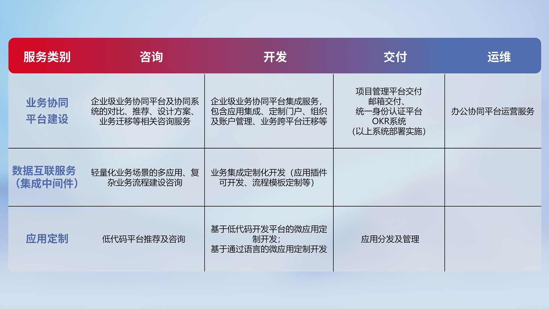 针对钉钉、、、、企微、、、IDaas等平台级产品提供产品的规划、、方案、、、交付、、、定制化开发等服务,,实现如统一协同办公、、、智能客户服务、、混合会议管理、、智能数据查询、、、、等业务场景,,实现数字化转型。。。。