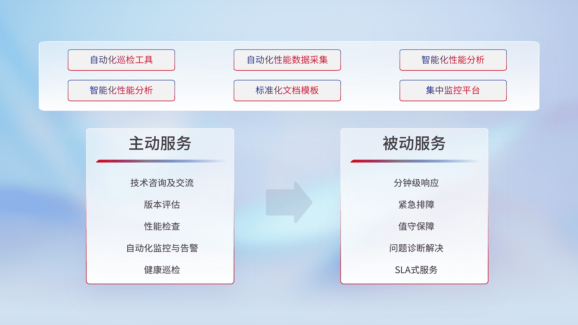 智能化工具和标准化文档,,,,保障服务质量,,提供主动服务(包含技术咨询、、版本评估、、性能检查、、、、自动化监控与告警、、、、健康巡检)和被动服务包含(分钟级响应、、、紧急排障、、值守保障、、、、问题诊断解决、、SLA服务)。。